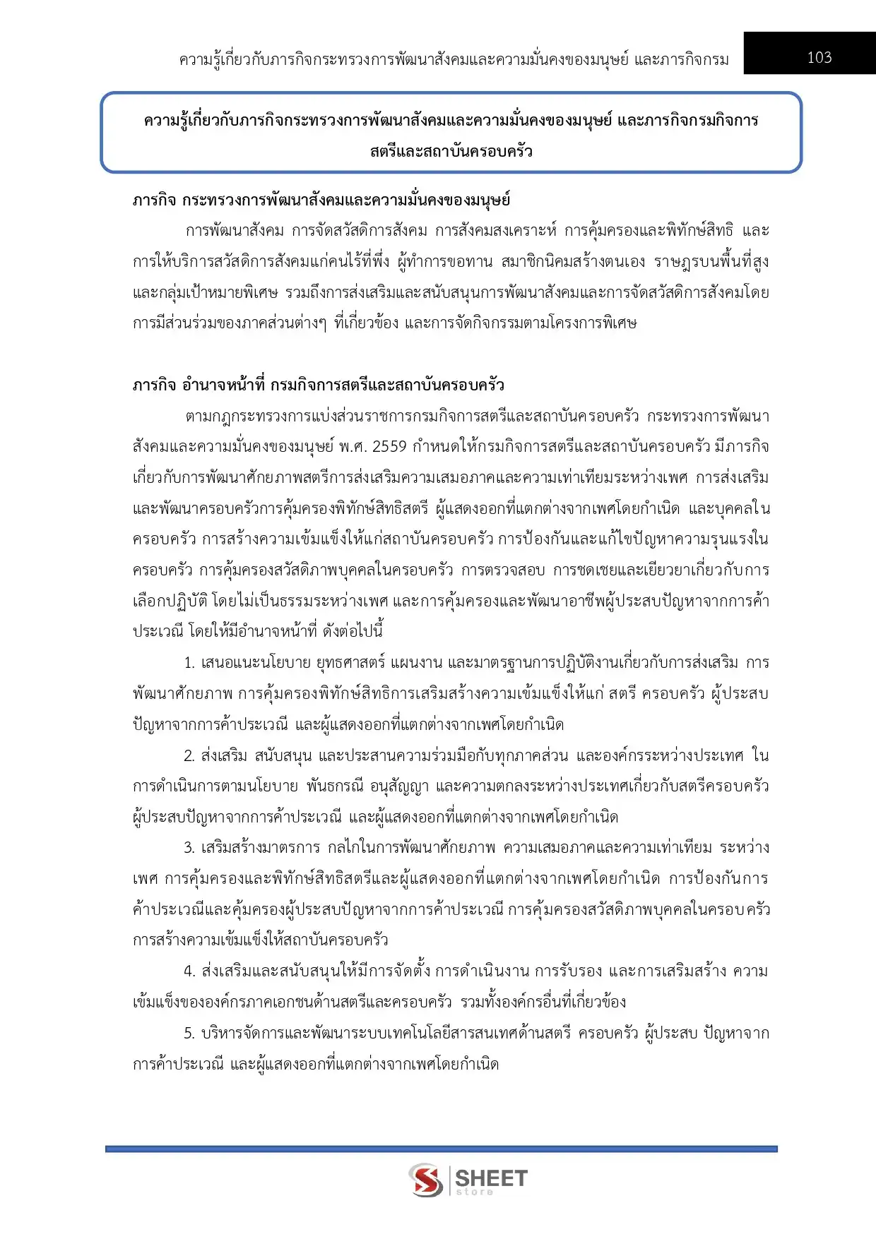 – ความรู้เกี่ยวกับภารกิจกระทรวงการพัฒนาสังคมและความมั่นคงของมนุษย์ และภารกิจกรมกิจการสตรีและสถาบันครอบครัว