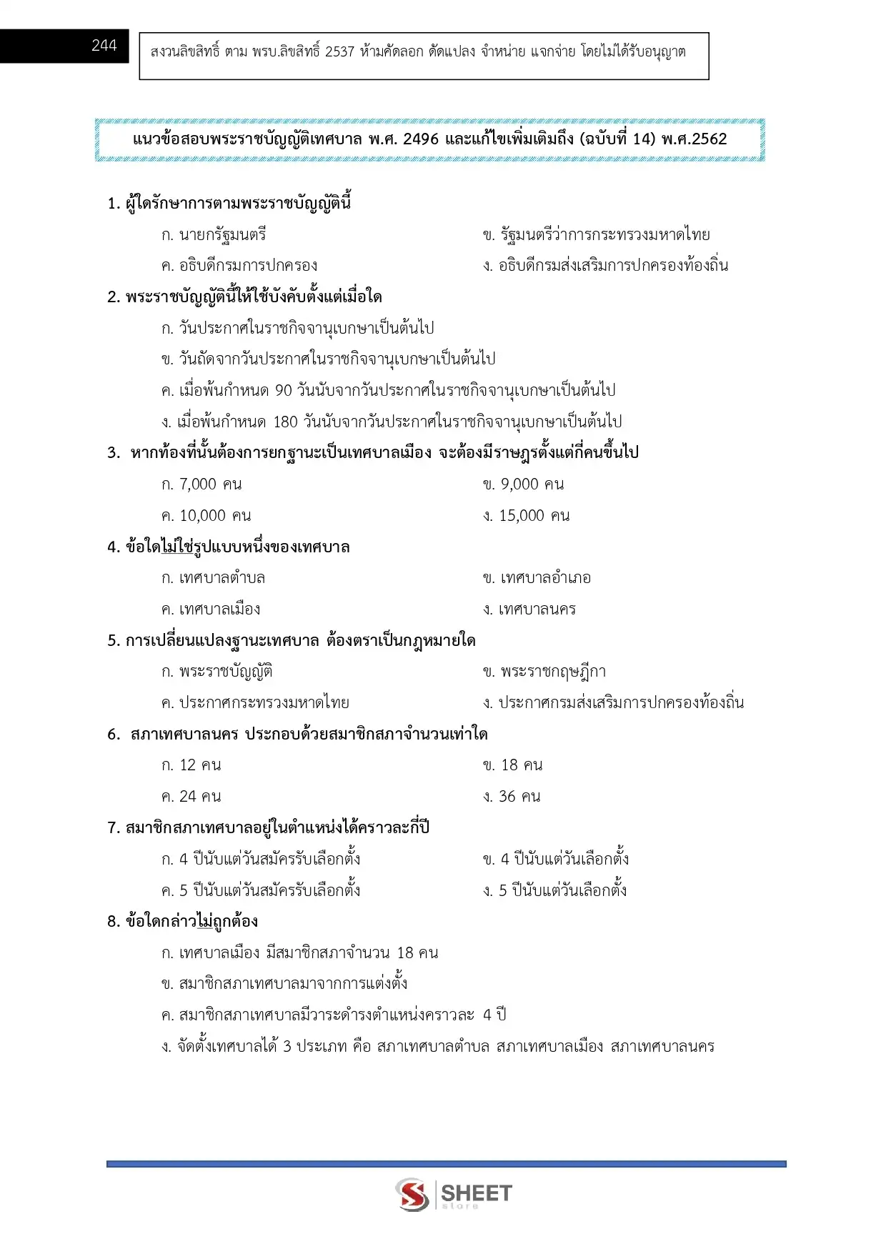 - แนวข้อสอบพระราชบัญญัติเทศบาล พ.ศ. 2496 และที่แก้ไขเพิ่มเติมถึง (ฉบับที่ 14) พ.ศ. 2562)