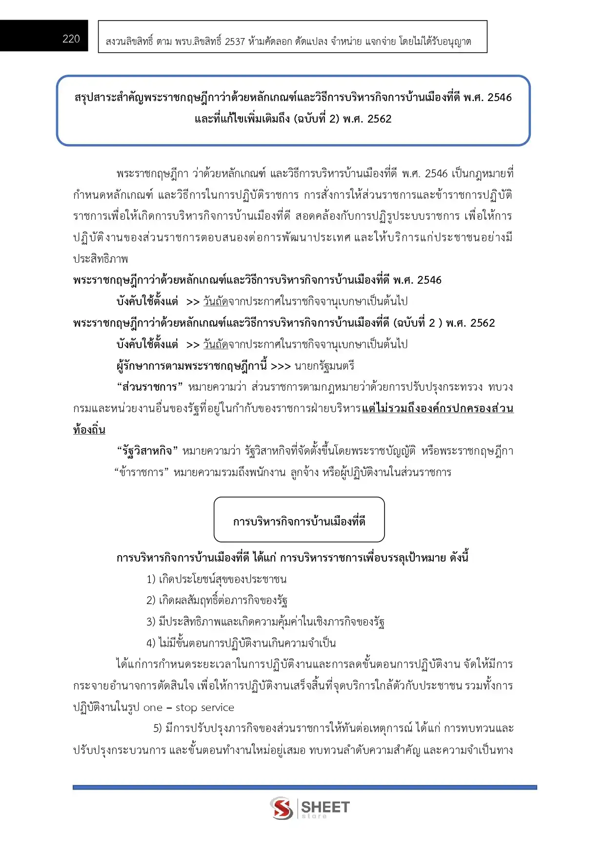 – แนวข้อสอบพระราชกฤษฎีกาว่าด้วยหลักเกณฑ์ และวิธีการบริหารบ้านเมืองที่ดี พ.ศ. 2546 และที่แก้ไขเพิ่มเติมถึง (ฉบับที่ 2) พ.ศ. 2562
