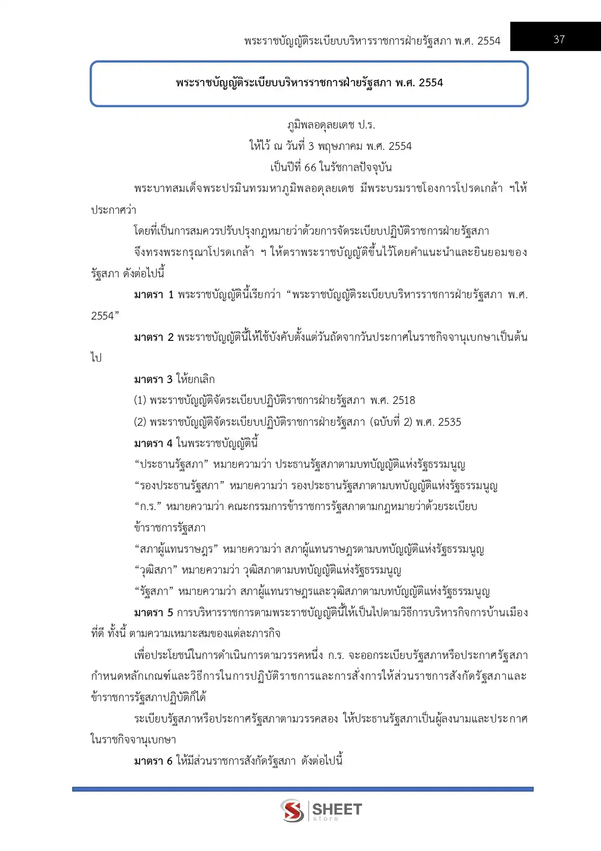 – พระราชบัญญัติระเบียบบริหารราชการฝ่ายรัฐสภา พ.ศ. 2554