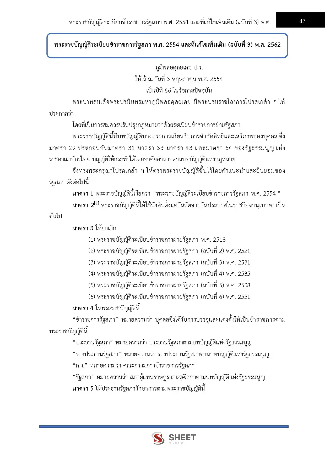 – พระราชบัญญัติระเบียบข้าราชการรัฐสภา พ.ศ. 2554 และที่แก้ไขเพิ่มเติม (ฉบับที่ 3) พ.ศ. 2562