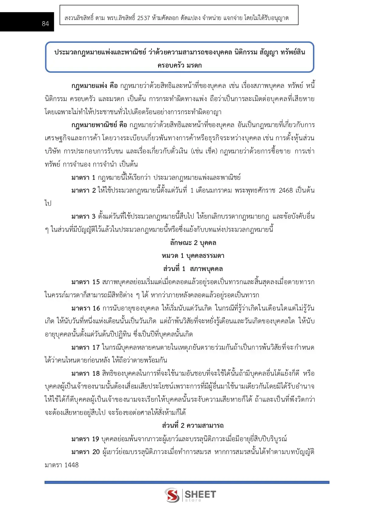 – ประมวลกฎหมายแพ่งและพาณิชย์ ว่าด้วยความสามารถของบุคคล นิติกรรม สัญญา ทรัพย์สิน ครอบครัว มรดก