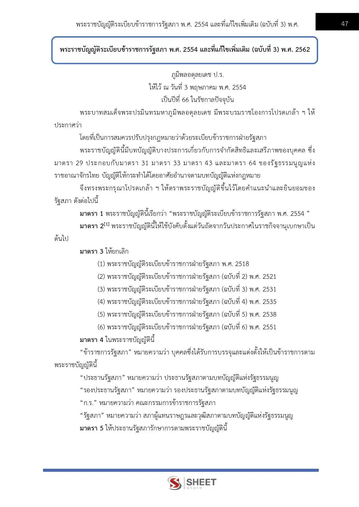 – พระราชบัญญัติระเบียบข้าราชการรัฐสภา พ.ศ. 2554 และที่แก้ไขเพิ่มเติม (ฉบับที่ 3) พ.ศ. 2562