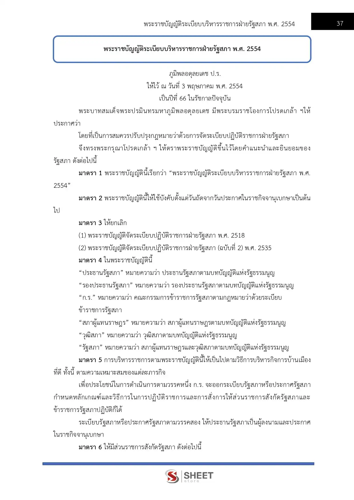 – พระราชบัญญัติระเบียบบริหารราชการฝ่ายรัฐสภา พ.ศ. 2554